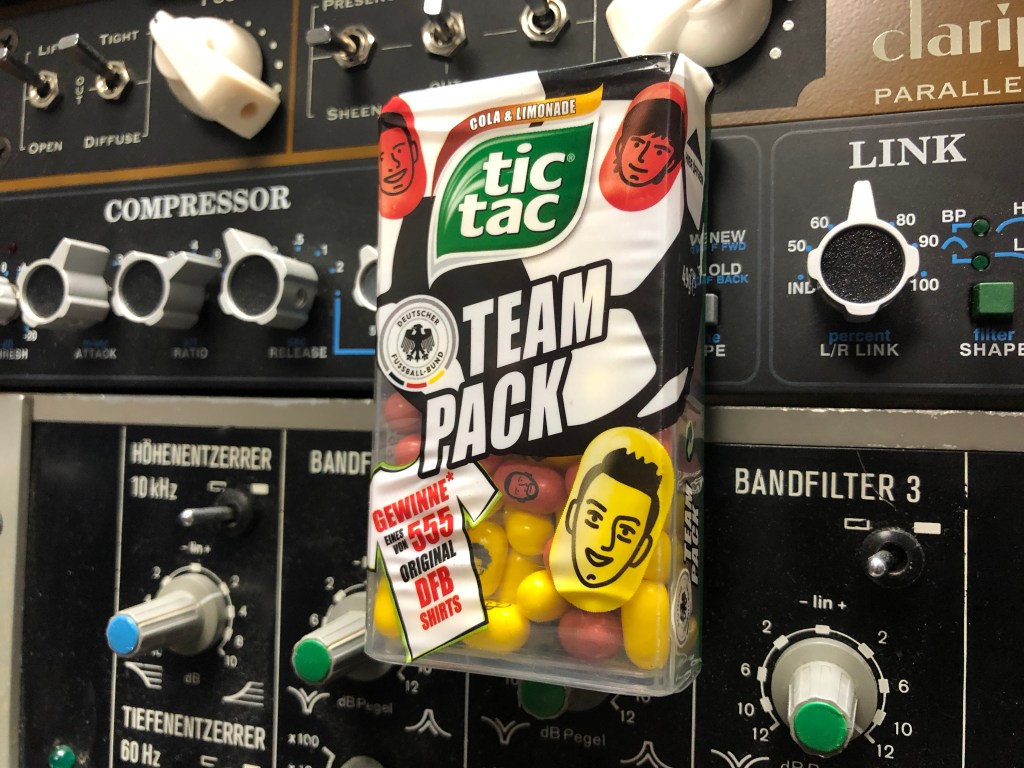 Heyhey, it’s #TicTacTuesday! The 108th variety added to the Tic Tac collection at VOCOMOTION Studios: Team Pack (Cola & Limonade). These come to us from Germany, by way of Ljubljana, Slovenia and branded with the logo for the Deutscher Fussball-Bund (German Football Association).